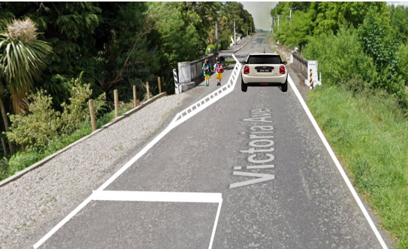 Last month Council approved an option that will see the bridge turned into a single lane, priority give-way bridge with line marking to permanently designate a pedestrian area, along with new pavement connecting the bridge to the footpath on the town side. Preparatory work has started and the permanent solution is expected to be completed in November. Below is an illustration of what the new set-up will look like.