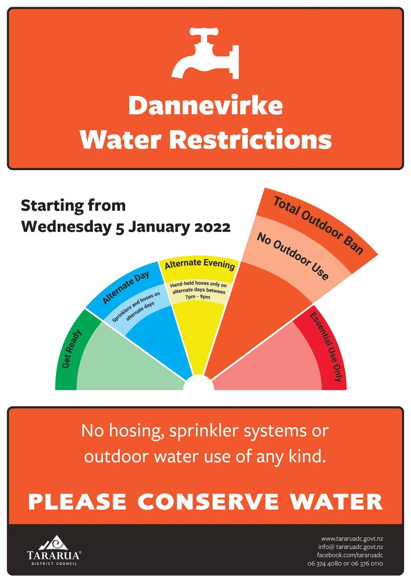 Dannevirke's water restriction level is moving to Level 4 - Total Outdoor Ban, effective Wednesday 5 January 2022.