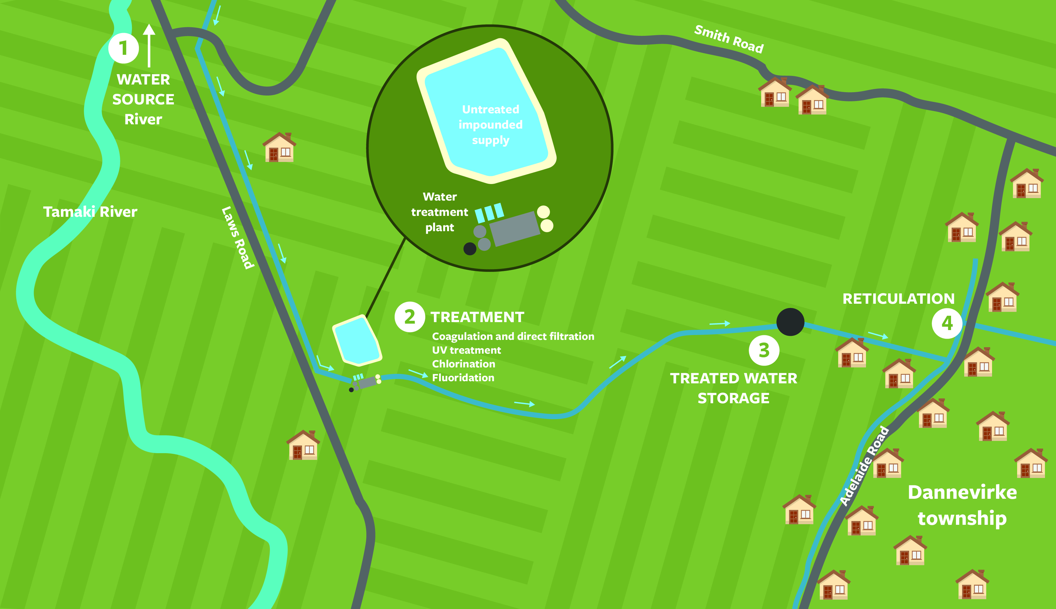 Water is taken from the Tamaki River and treated at the water treatment plant along Laws Road.
